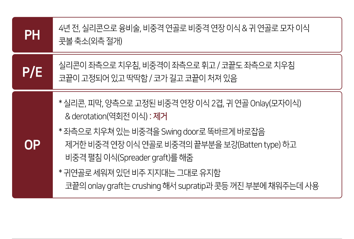 OP * ½Ç¸®ÄÜ, ÇǸ·, ¾çÃøÀ¸·Î °íÁ¤µÈ ºñÁß°Ý ¿¬Àå ÀÌ½Ä 2°ã, ±Í ¿¬°ñ Onlay(¸ðÀÚÀ̽Ä) & derotation(¿ªÈ¸Àü À̽Ä) :Á¦°Å * ÁÂÃøÀ¸·Î Ä¡¿ìÃÄ ÀÖ´Â ºñÁß°ÝÀ» Swing door·Î ¶È¹Ù¸£°Ô ¹Ù·ÎÀâÀ½ Á¦°ÅÇÑ ºñÁß°Ý ¿¬Àå ÀÌ½Ä ¿¬°ñ·Î ºñÁß°ÝÀÇ ³¡ºÎºÐÀ» º¸°(Batten type) ÇÏ°í ºñÁß°Ý Æîħ À̽Ä(Spreader graft)¸¦ ÇØÁÜ * ±Í¿¬°ñ·Î ¼¼¿öÁ® ÀÖ´ø ºñÁÖ ÁöÁö´ë´Â ±×´ë·Î À¯ÁöÇÔ ÄÚ³¡ÀÇ onlay graft´Â crushing ÇØ¼ supratip°ú Äàµî ²¨Áø ºÎºÐ¿¡ ä¿öÁִµ¥ »ç¿ë