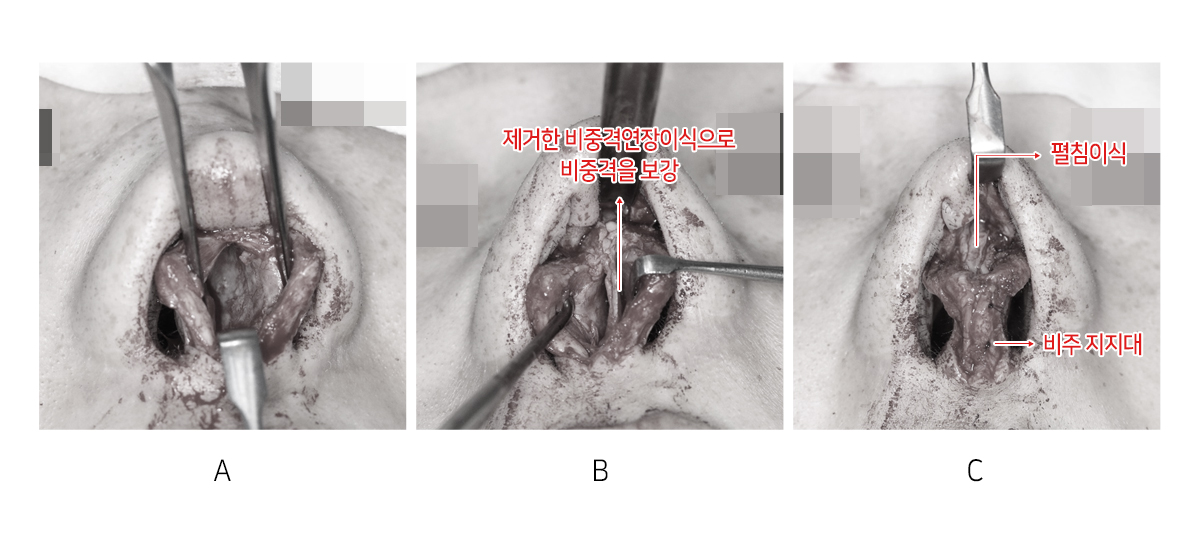 A : ½Ç¸®ÄÜ, ºñÁß°Ý ¿¬Àå À̽ÄÀ» Á¦°ÅÇÑ ÈÄ, ºñÁß°ÝÀÌ ÈÖ¾îÁ® ÀÖ´Â °ÍÀ» º¸¿©ÁØ´Ù. B : Swing door operationÀ¸·Î ºñÁß°ÝÀ» Áß¾ÓÀ¸·Î À̵¿½Ã۰í, Á¦°ÅÇÑ ¿¬ÀåÀ̽ÄÀ¸·Î ºñÁß°Ý ³¡ ºÎºÐÀ» º¸°. C : ºñÁÖ ÁöÁö´ë(±Í ¿¬°ñ) °ú Æîħ À̽Ä(Spreader graft)¸¦ ÇÑ »óÅÂ.