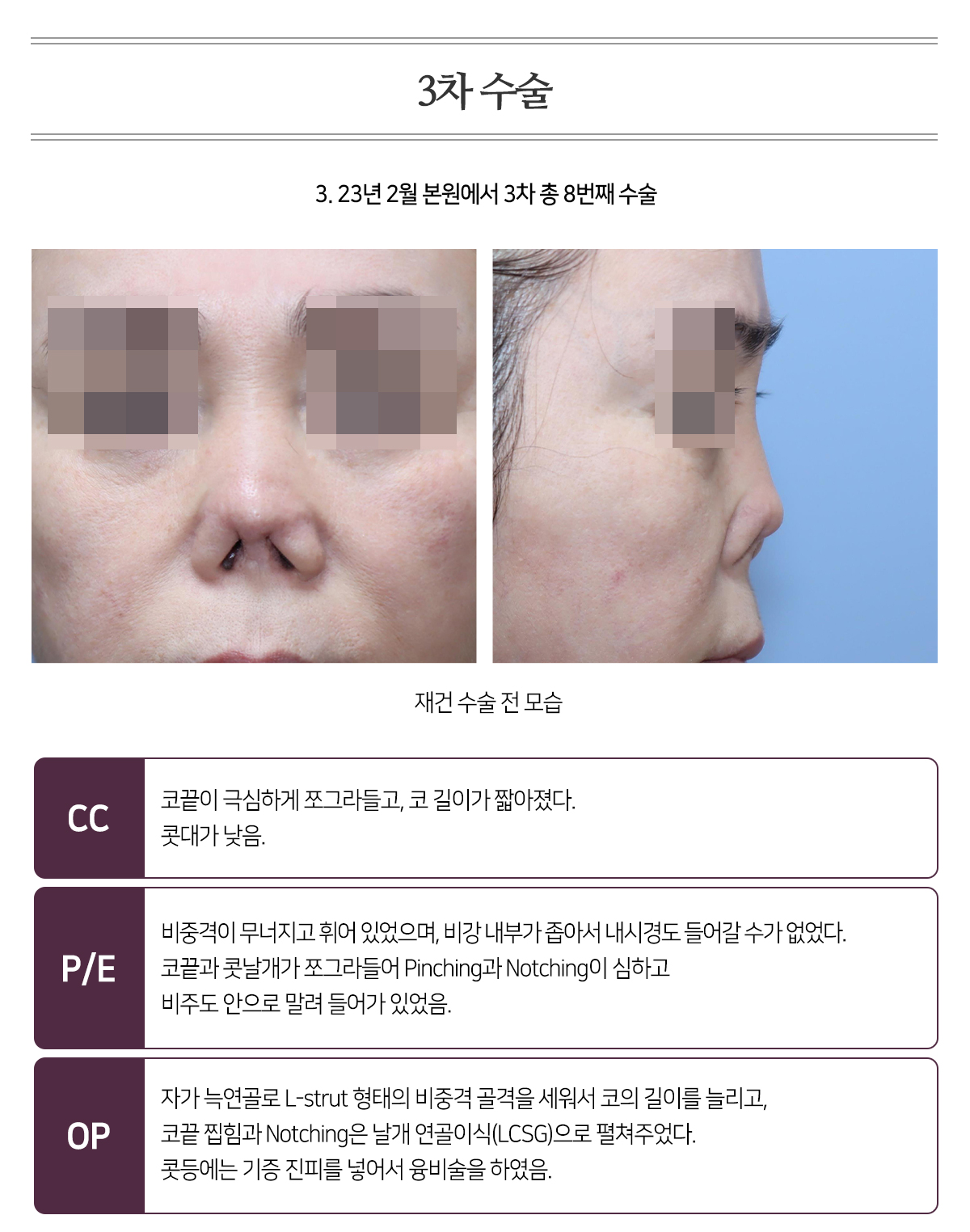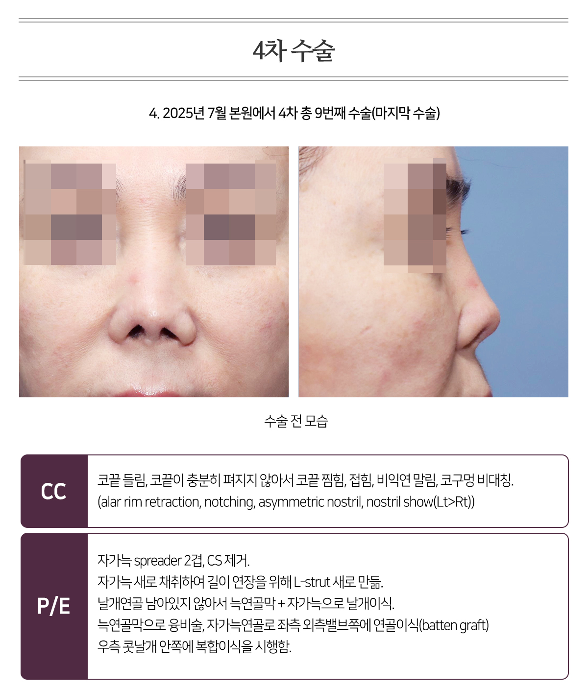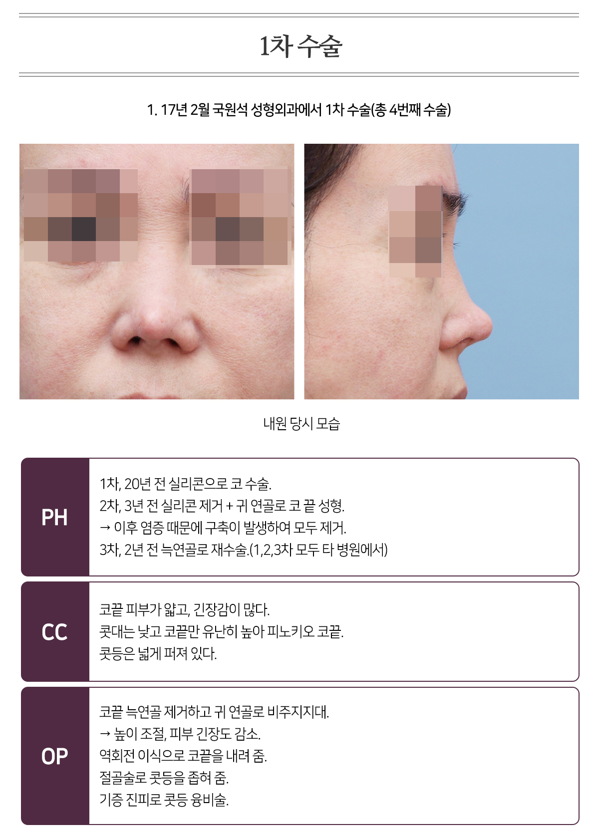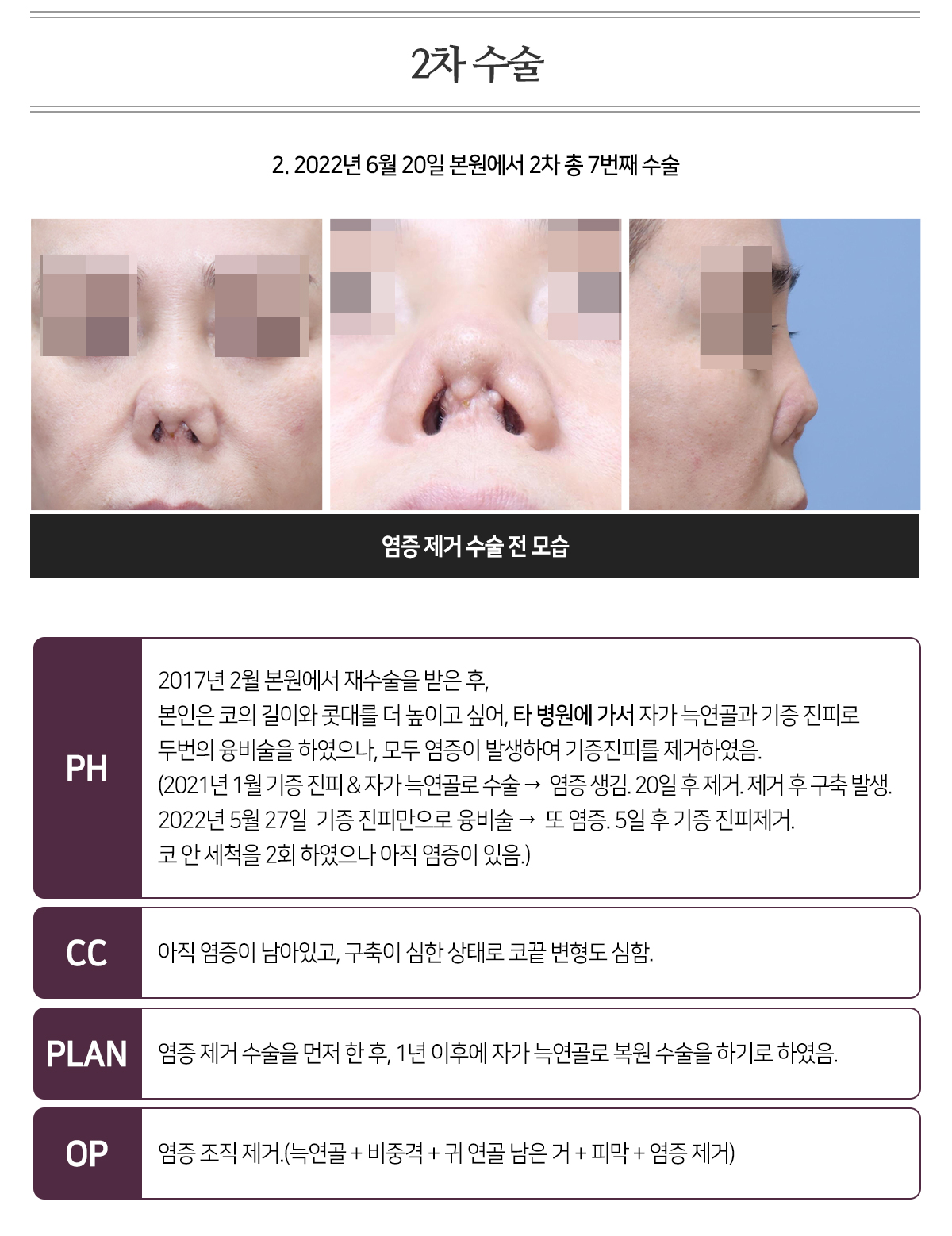 PH 2017³â 2¿ù º»¿ø¿¡¼ Àç¼ö¼úÀ» ¹ÞÀº ÈÄ, º»ÀÎÀº ÄÚÀÇ ±æÀÌ¿Í Äà´ë¸¦ ´õ ³ôÀÌ°í ½Í¾î, Ÿ º´¿ø¿¡ °¡¼ ÀÚ°¡ ´Á¿¬°ñ°ú ±âÁõ ÁøÇÇ·Î µÎ¹øÀÇ À¶ºñ¼úÀ» ÇÏ¿´À¸³ª, ¸ðµÎ ¿°ÁõÀÌ ¹ß»ýÇÏ¿© ±âÁõÁøÇǸ¦ Á¦°ÅÇÏ¿´À½. (2021³â 1¿ù ±âÁõ ÁøÇÇ & ÀÚ°¡ ´Á¿¬°ñ·Î ¼ö¼ú ¡æ ¿°Áõ »ý±è. 20ÀÏ ÈÄ Á¦°Å. Á¦°Å ÈÄ ±¸Ãà ¹ß»ý. 2022³â 5¿ù 27ÀÏ ±âÁõ ÁøÇǸ¸À¸·Î À¶ºñ¼ú ¡æ ¶Ç ¿°Áõ. 5ÀÏ ÈÄ ±âÁõ ÁøÇÇÁ¦°Å.